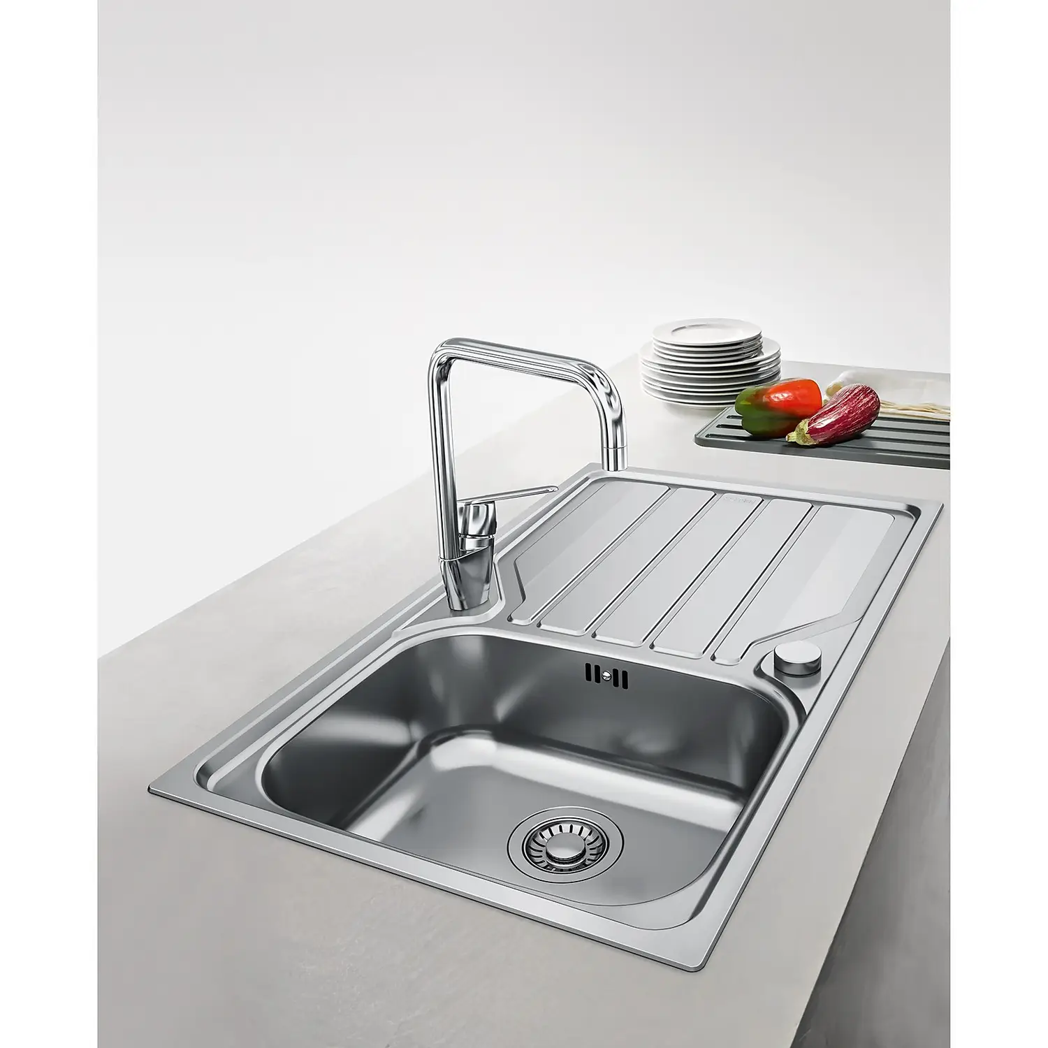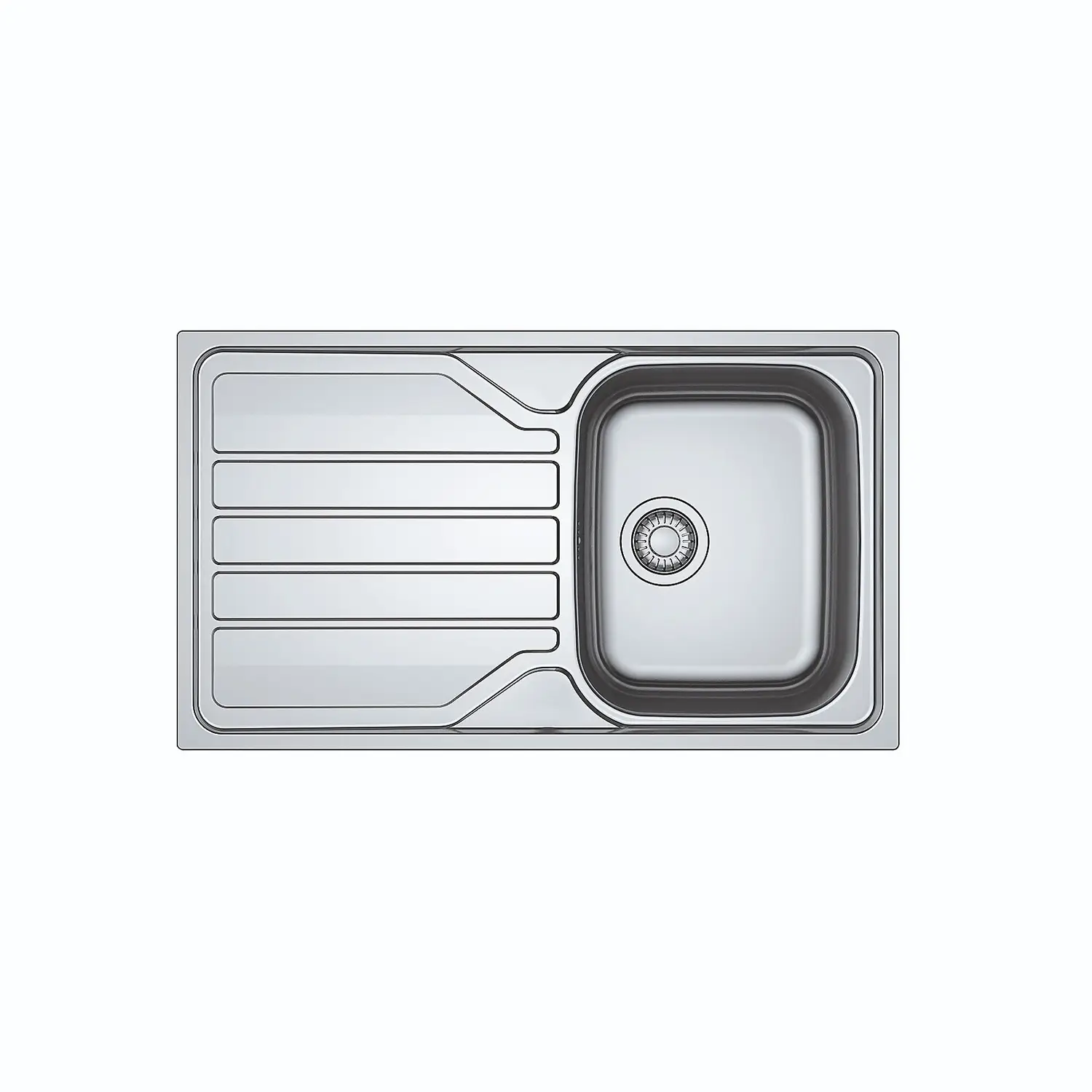 This 1 bowl inset sink boasts a beautifully modern design with crisp drainer grooves. Made of stainless steel, this material helps keep the washing up area more hygeinic. The Franke Flash has a pre-cut tap hole on the front and back, giving you the freedom to position the drainer to the left or right hand side of the bowl. A blanking plate is included to cover the hole which isn’t required. This sink is both durable and practical.