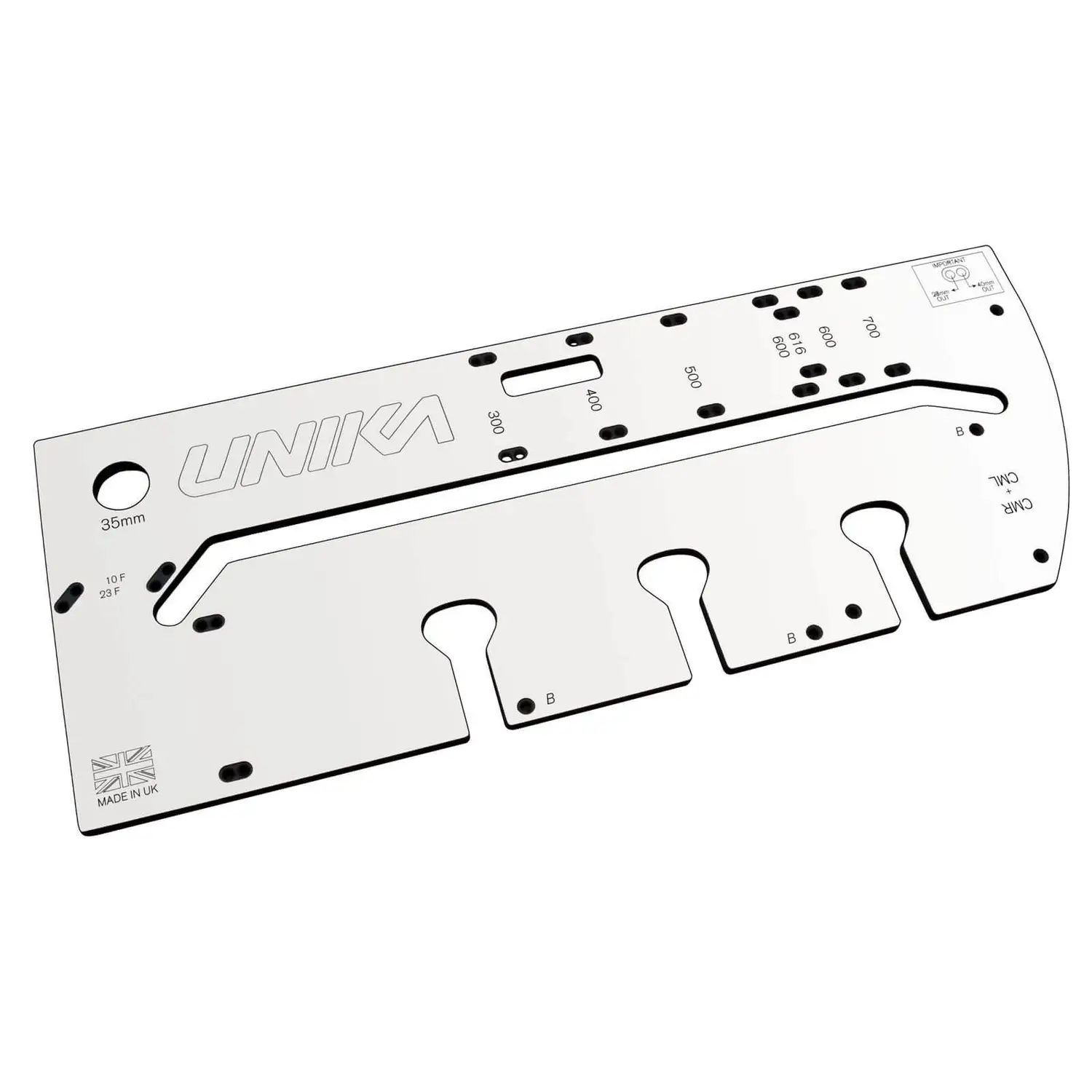 The Multi-Surface Jig cuts 300, 400, 500, 600, 616, 650 & 700mm worktop widths.